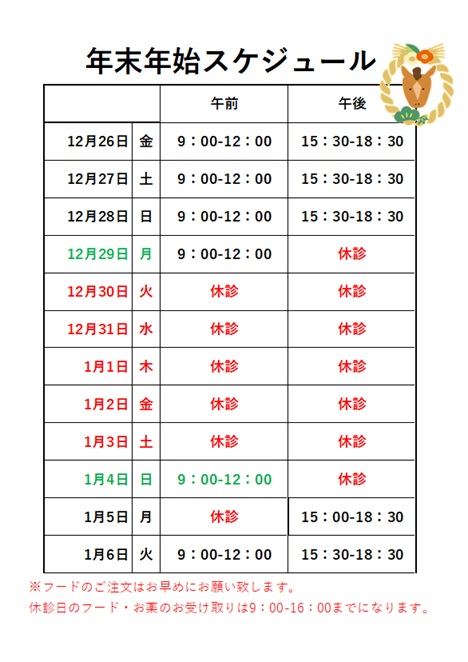年末年始、お薬・フードのお受取りや継続した治療が必要な方は、