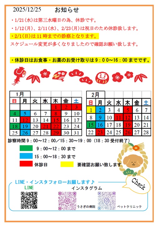 1月の診察スケジュールのお知らせ🐶🐱🐰🎄